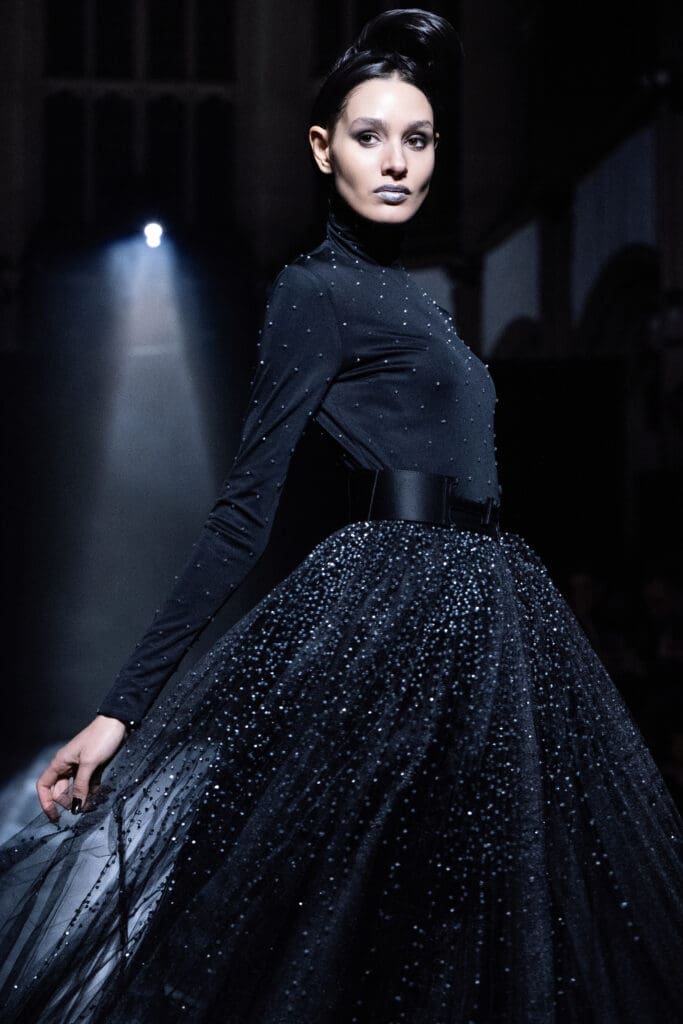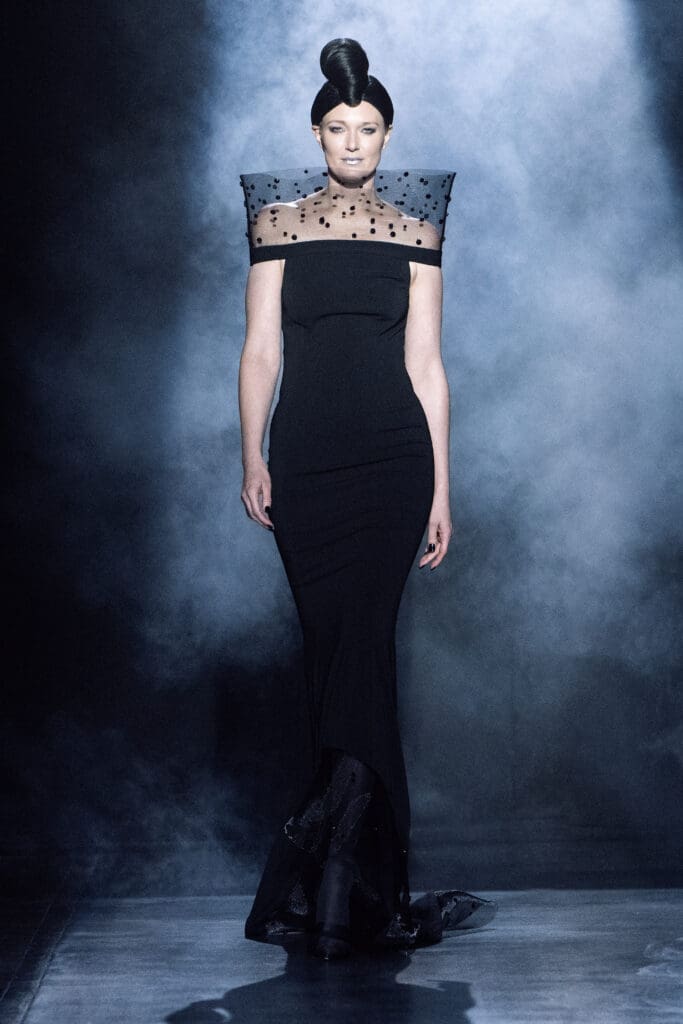 Fashion news is filled with tributes to nineties minimalism, as exemplified by Carolyn Bessette Kennedy’s character in FX/Hulu’s series Love Story: John F. Kennedy Jr. & Carolyn Bessette. Zang summoned this minimalist spirit with his show-stopping evening gowns, which strolled the runway in an aura of elegant simplicity.
